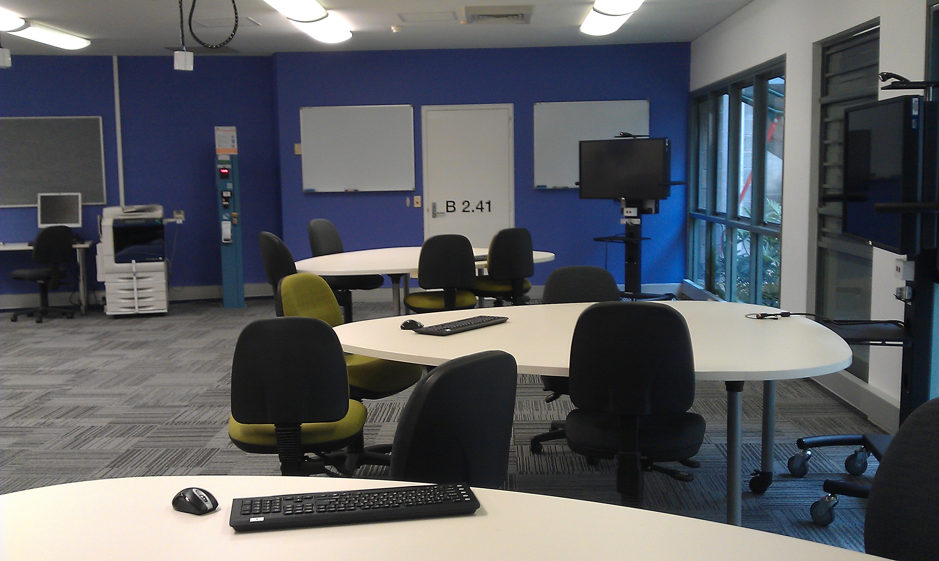Our blended learning space is designed with six movable group hubs, each with an egg shaped table (really great design imo), movable chairs and a digital electronic workstation.  There is also a store room containing a trolley of 20 laptops.  Yesterday I went in to take some snaps: