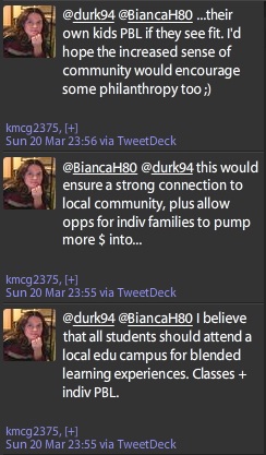 So I’m posting my tweets for tonight up here, just for the record.  I’d be interested in hearing other people’s visions for the school campus of the future.  Will there still be a distinction between ‘public’ and ‘private’?