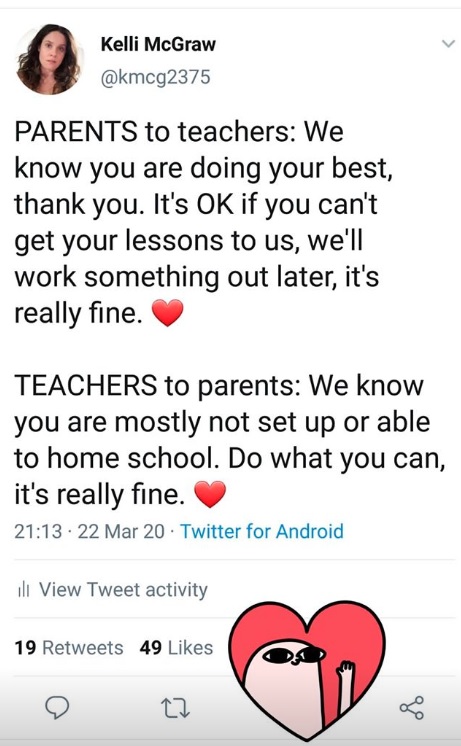 I do agree with the frustrated sentiment behind some of these laments and I think Steve Kolber summed feelings up well here in an article on 20th March: https://educationhq.com/news/another-stinging-insult-teachers-are-being-used-as-martyrs-in-covid-19-agenda-75456/. And yet… the phrase ‘in loco parentis’ plays on my mind. I’m not saying that teachers should feel obliged to work against their will or to put themselves at risk (they should not). I do think that school systems need to at least partially close soon, to allow a swathe of teachers to choose to work from home. But I do wonder why so many are surprised at the expectation that teachers act as frontline workers in a time of crisis, especially in public schools. In loco parentis – in place of a parent. It has always been my understanding that teaching is as much a ‘social’ service as an ‘educational’ one. I might have done more before now to make sure my pre-service teachers understood that too. I wish the government messages included acknowledgment of all this work and care without fear of the next enterprise bargaining agreement. They are so scared of having to pay teachers more if they acknowledge the depth of service they provide.