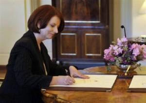 Firstly, ‘Scandal’ of the process of getting Gillard to be PM aside, I think she will do a decent job and wish her every success. It’s not an easy job for anyone to be successful in politics, let alone be PM. It is undeniably harder for a woman to be prime minister. That’s a big thing to say, I realise, as we all obviously believe in equality here. However, i’m making the point that it is harder for a woman to give up other responsibilities, and ‘expectations’ as a woman to become successful in such a career field. Women are ‘expected’ to become mothers and hold onto a career simultaneously. In fact, women are expected to be mothers overall. I’m not saying it’s like the ’50s again or anything drastic, but think about the societal expectation on women to reproduce, nurture, teach and care for children: it does exist ! Gillard has chosen not to have children in order to further her career- a move considered to be very bold and risky (for most). I admire her dedication to her work, and that she does not feel the need to define herself by children, or by expectation. I think by doing this she is breaking the gender expectations…of couse i’m not bashing mothers – I admire their job as well – but non-mothers/archetypal ‘career women’ get bashed about just as much. Good on her 🙂