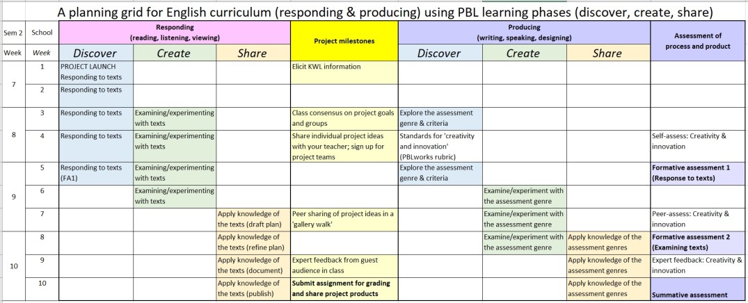 I believe the strength of the planning grid is that it allows a visual map to be formed, showing where the discover, create, share phases may overlap differently for text response and text production. In English, this could contribute a key resource for managing the mushy middle of a project by ensuring a realistic balance of directed learning and product creation can be achieved.