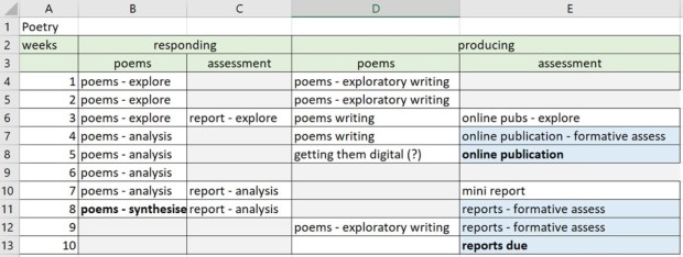 It needed a bit of explaining, which I found difficult to do without an example. I was able to show the two MTeach class examples that had lead me down this road – we’d been co-constructing a map of a term-long inquiry into poetry, playing around to answer the question of how to handle multiple assessment tasks, and how to make a text study overlap meaningfully with new text creation. But because the MTeach class example didn’t use the three PBL phases (we weren’t ‘there yet’), it’s explanatory power was limited: