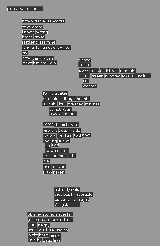 I found this great site full of creative writing resources (languageisavirus.com), which includes a range of electronic poetry kits. You can choose from poets such as ee cummings and Jack Kerouac – I chose Sylvia Plath, and here is the poem that I made: