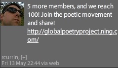 Now I’ve joined the Global Poetry Project Ning. I figured tonight was as good a time as any to post a poem in a new place and this one promises ‘a space for members to expand upon their cultural views through the writing and reading of poetry’.